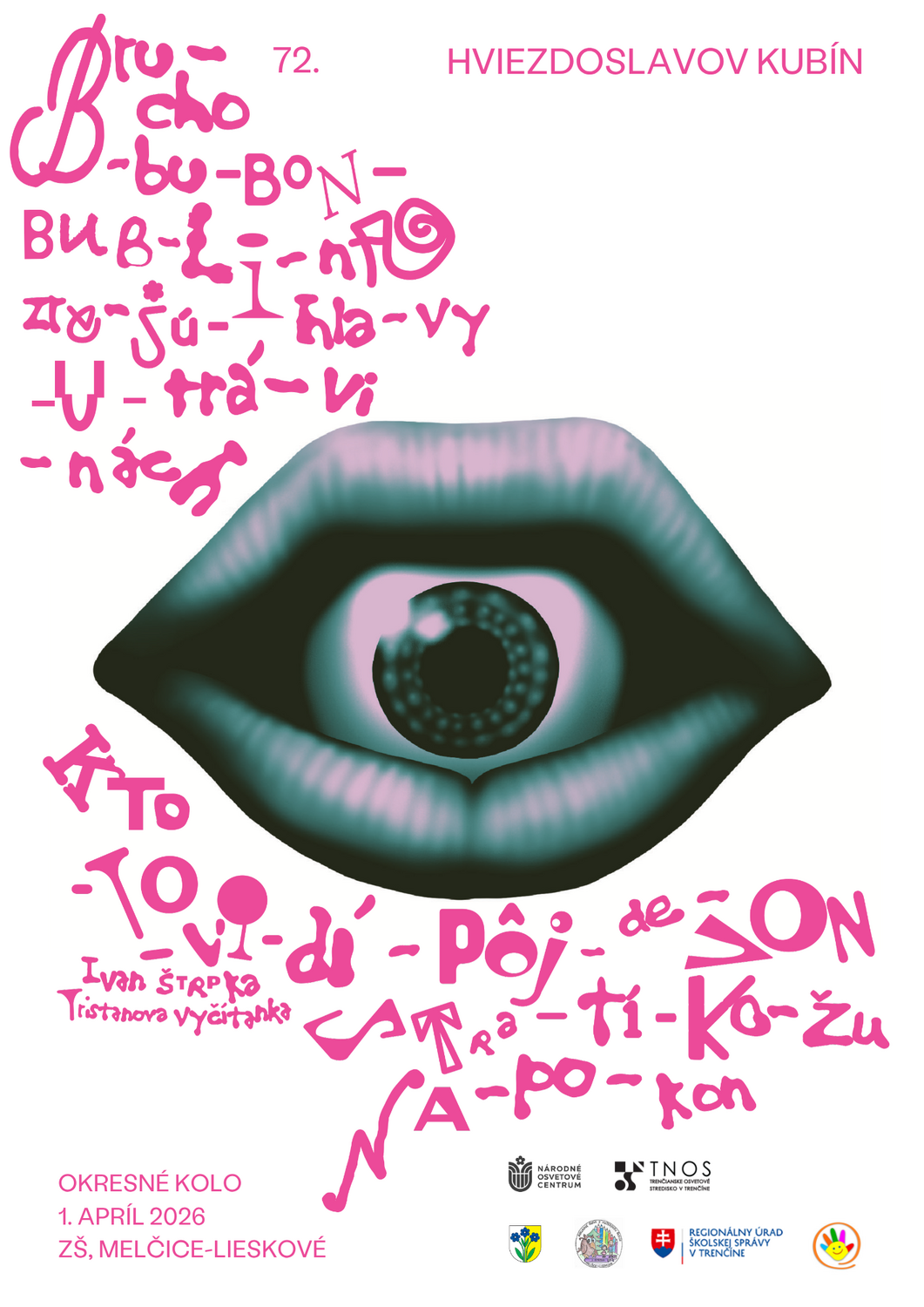 Okresné kolo súťaže v umeleckom prednese poézie a prózy (I. – III. kategória) pre žiakov z okresu Trenčín sa uskutoční v stredu 1. apríla 2026 od 8:30 hod. v priestoroch ZŠ s MŠ Jána Smreka Melčice-Lieskové.
