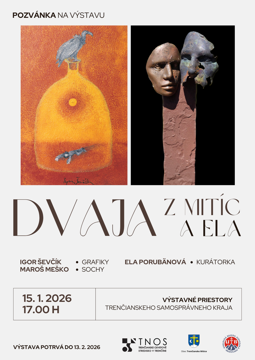 Pozývame vás na výstavu Dvaja z Mitíc a Ela, ktorá predstavuje tvorbu autorov Igora Ševčíka a Maroša Meška. Výstava spája grafiky a sochy, v ktorých sa stretáva osobitý výtvarný jazyk oboch autorov s kurátorským konceptom Ely Porubänovej.